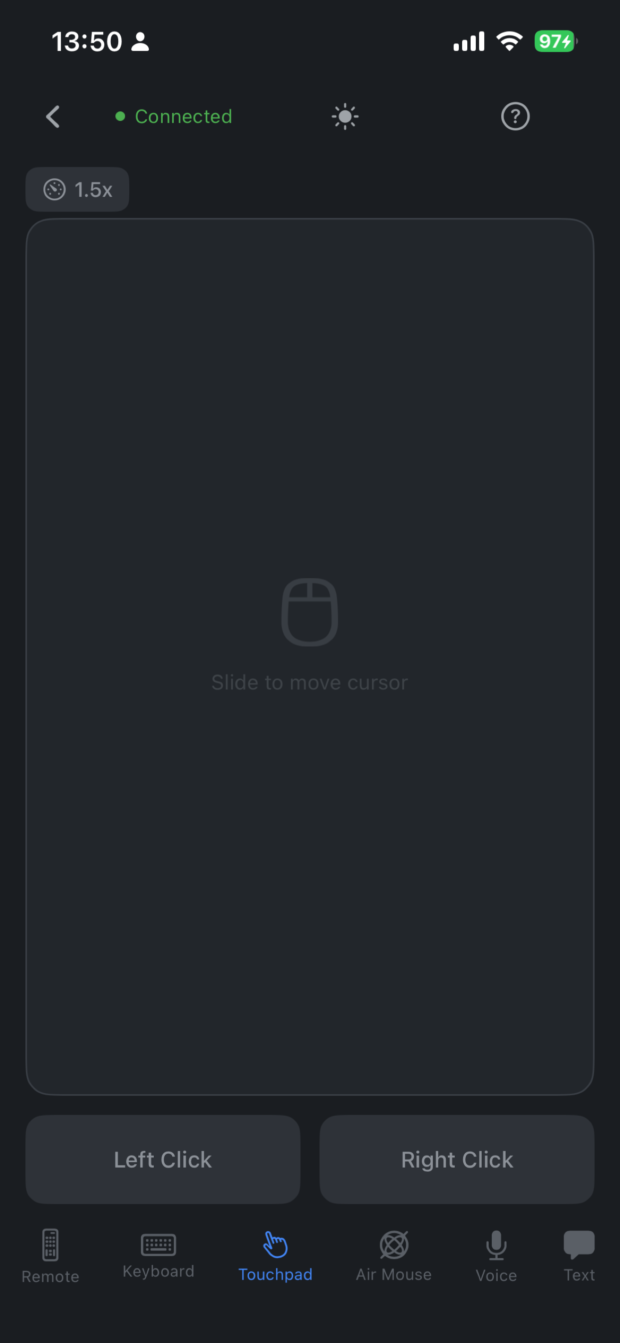 - Touchpad: slide-to-move + Left / Right Click, sensitivity up to 1.5×